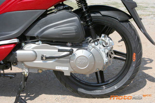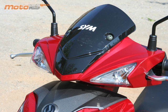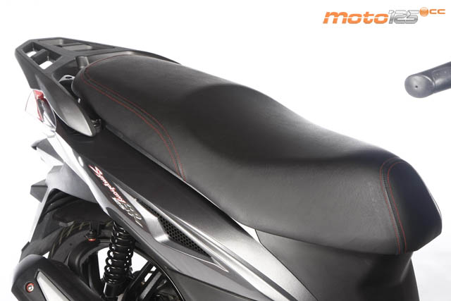 Tren delantero de impacto: un llamativo freno de disco “wave” en la misma medida que el trasero (226 mm), mordido por pinza de doble pistón, llantas de aleación de cinco palos dobles y neumático de perfil más bajo y ancho que el DD. | Un detalle que se va perdiendo, pero que SYM mantiene en sus modelos, es la guantera tras el escudo protegida por cerradura. Aún desaprovechando el paso del tubo principal del bastidor, queda suficiente espacio a los lados. | El asiento es de nuevo diseño, suficientemente largo, y delimita bien las zonas del pasajero y conductor. Como detalle “racing” las costuras se han hecho utilizando hilo de color rojo, y el tapizado es antideslizante. |