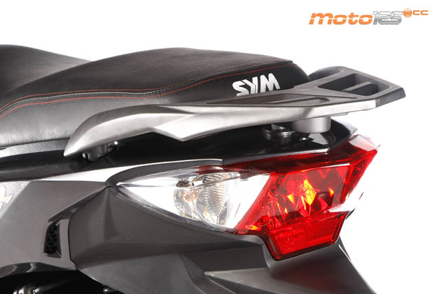 A todo esto, hay que añadir la posibilidad que ofrece la amplia plataforma plana para apoyar los pies y llevar grandes bultos entre ellos, la amplia guantera con cerradura detrás del escudo y el robusto, y también amplio, portabultos posterior en fundición de aluminio. Las formas de los laterales y el nuevo y amplio asiento con los detalles racing de las costuras, refuerzan la agresividad del conjunto. Se aparta del diseño clásico y elegante con tono serio que aportan todos los “ruedas altas” del mercado, incluyendo a sus hermanos SymPhony DD y HD Evo, un punto a favor para los que quieran ir un poco a contracorriente y les guste romper esquemas.