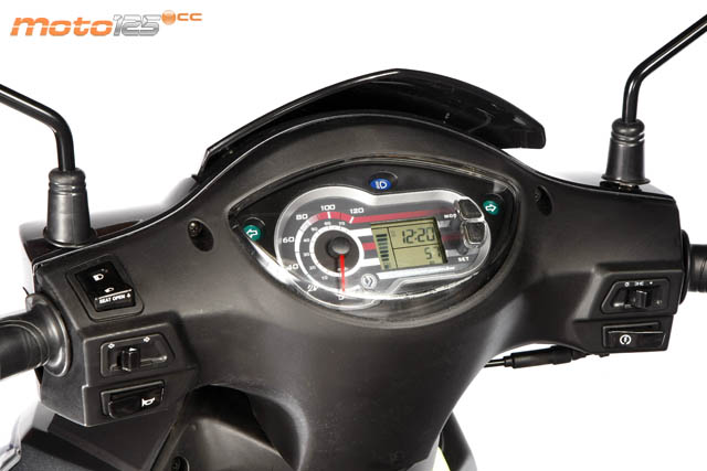 Como te contábamos antes, este SymPhony SR quiere romper con los moldes tradicionales de su segmento, y eso se nota en todos los detalles. En su estilizada figura de líneas afiladas y agresivas, localizamos un faro de grandes proporciones en el escudo frontal (muy similar al que emplea el Jet-4 125), dejando al manillar “ciego” con una discreta cúpula de color ahumado. La instrumentación en sí, está muy cuidada, combinando un velocímetro analógico con una pantalla digital en la que se da cabida a la hora, cuentakilómetros varios e incluso un nivel gráfico correspondiente al nivel de gasolina. Los mandos están en su sitio adecuado y ofrecen un buen tacto.