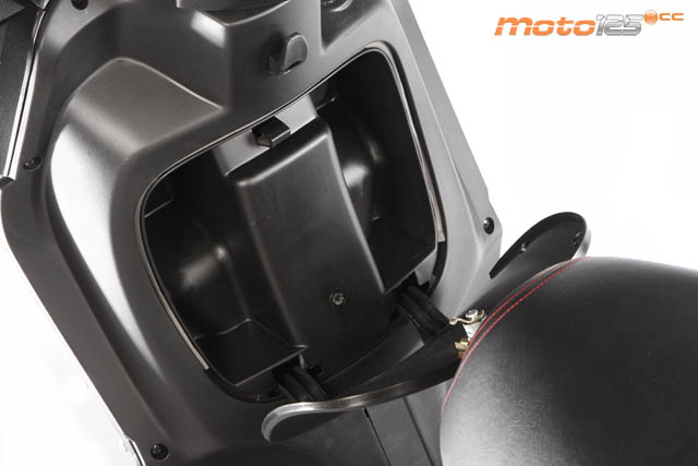 Donde también se luce este Sym es en capacidad de carga. El espacio bajo el asiento cuestiona la afirmación de que no es posible conseguir espacio para albergar un casco de rueda alta, y menos un integral. Pues, a pesar de su delgadas proporciones, el SymPhony SR, aunque justito, lo ha conseguido, y sin que se le note el “embarazo”. La apertura se hace desde el contacto, o bien, dando las ráfagas.