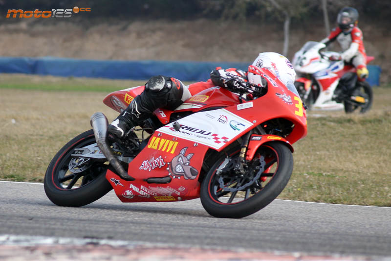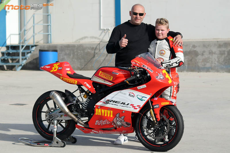 A Javier Sánchez “Javivi” le parece más divertido el motor de dos tiempos de su Kawa KX de supermotard. Con ella se permite saludar con “uves” en la mano izquierda soltando el manillar y rodilla derecha rozando el asfalto. Debajo podemos ver a Javier con su padre José Miguel posando con la Rieju RS3 Challenge 180.