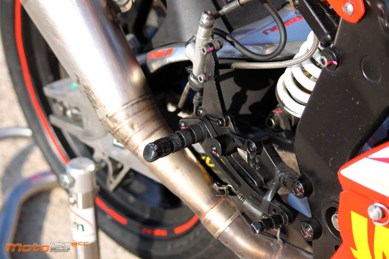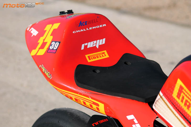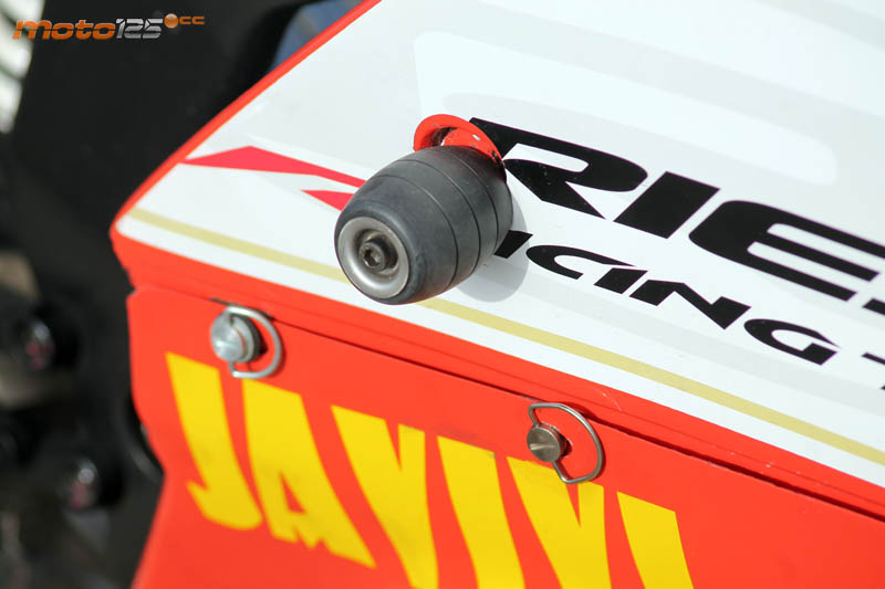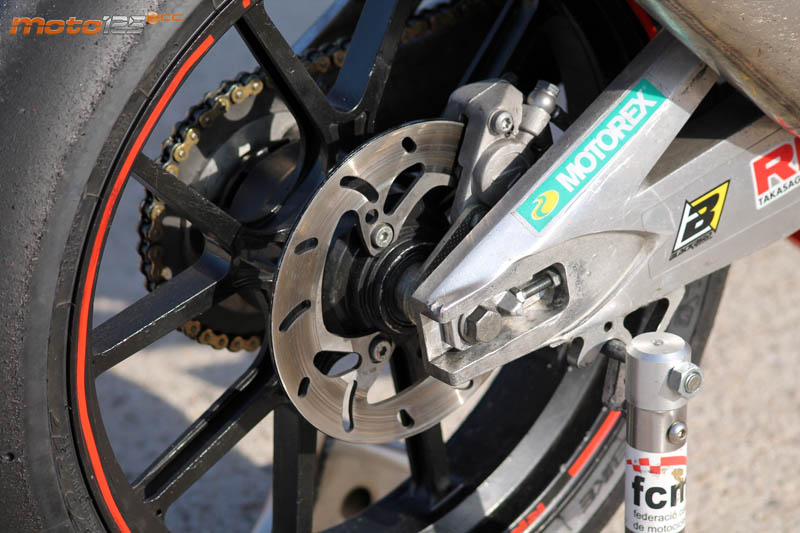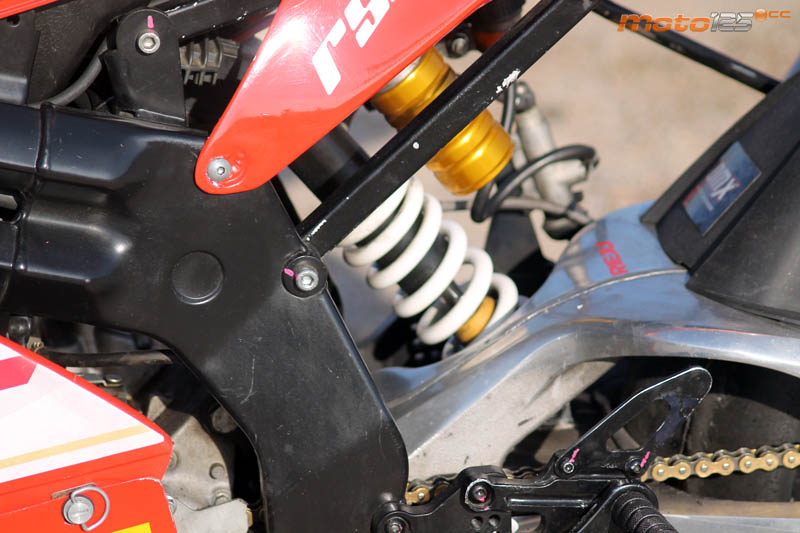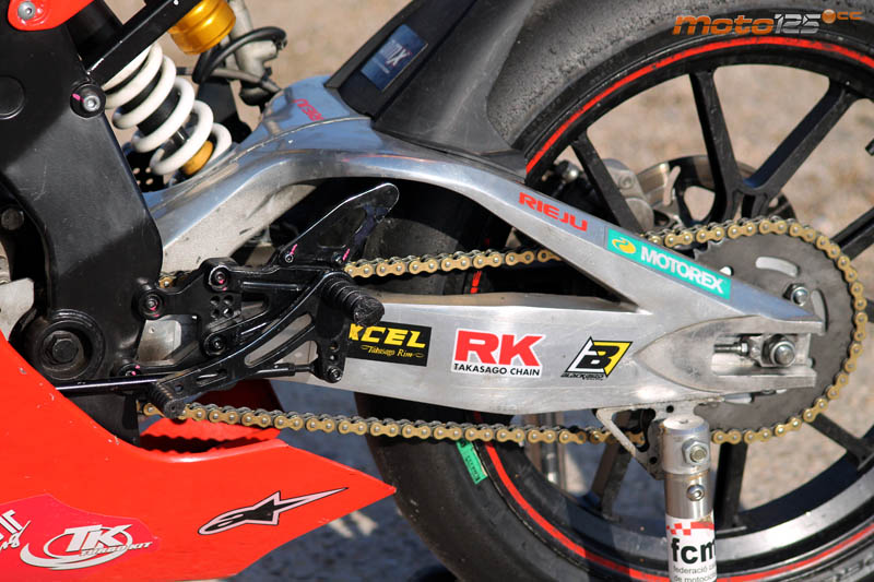 Uno de los principales esfuerzos que han hecho Rieju y Project Racing para convertir una RS3 en una moto de carreras infantil se ha centrado en dos apartados: las dimensiones de la moto y el peso. Para lo primero, se trataba de bajar la altura del puesto de conducción con el fin de que los chavales pudieran “hacer pie” y llegar al suelo. Por ello se ha cambiado la horquilla por una de menor recorrido y altura y, al mismo tiempo, se ha modificado por completo el subchasis trasero por otro que ofrece una menor altura de asiento a la vez que es más ligero al no contemplarse la posibilidad de llevar un pasajero. En el tren posterior se conservan todos los elementos de serie como el basculante de aluminio (una obra maestra de orfebrería), monoamortiguador oleoneumático con botella separada y disco de freno de 220 mm. Se pensó en cambiar el depósito de combustible de 12 litros de capacidad por otro de menos volumen que a la vez fuese más corto pensando en la talla de los pilotos, pero finalmente se descartó por conservar la imagen característica de la RS3.