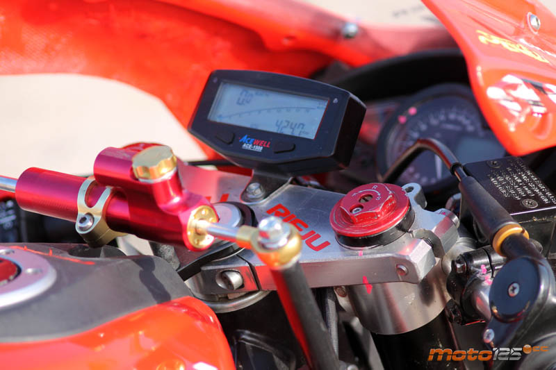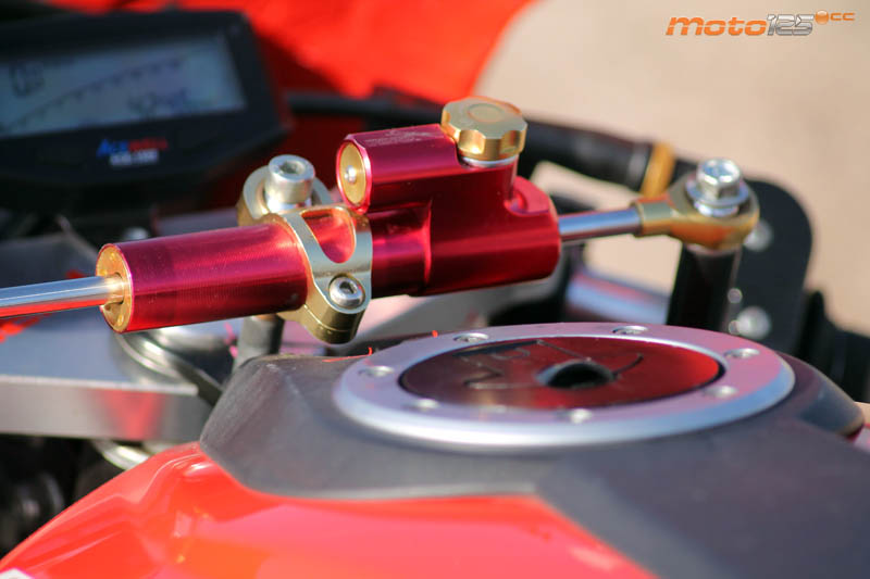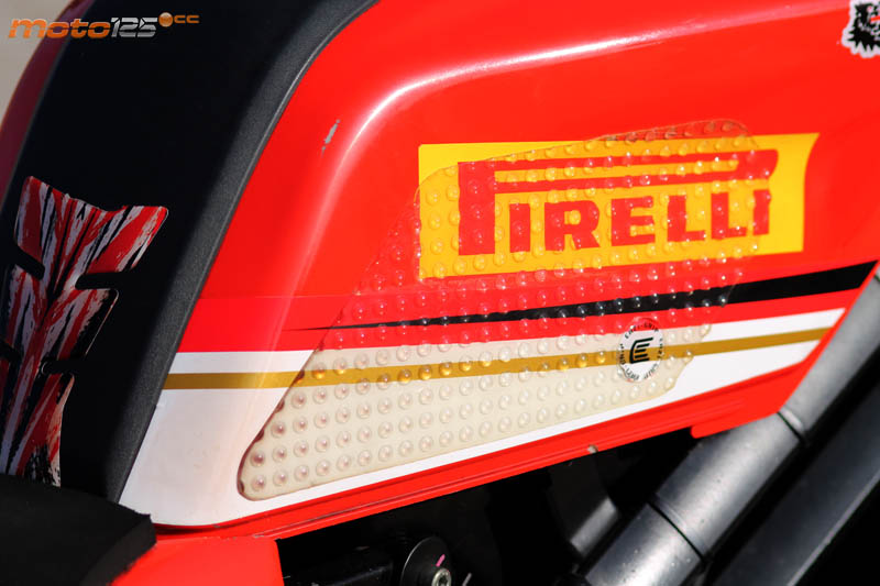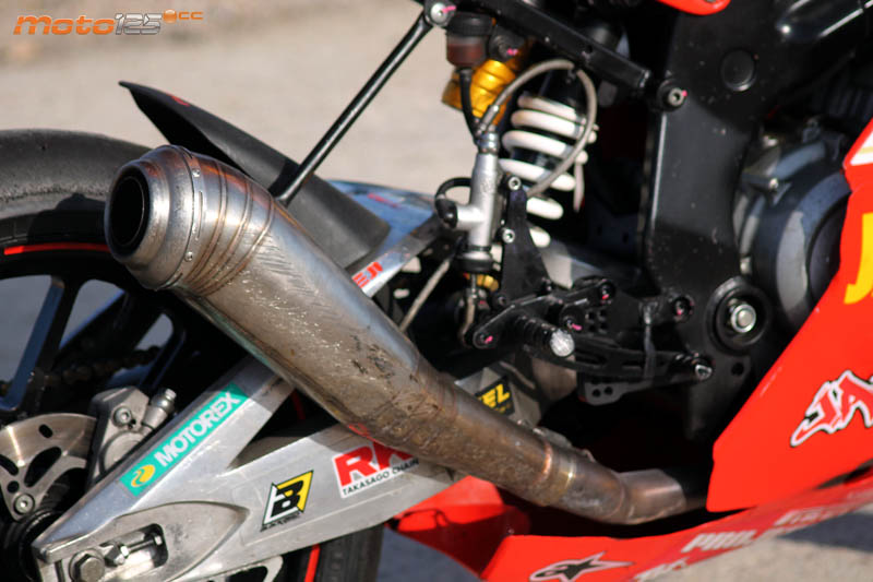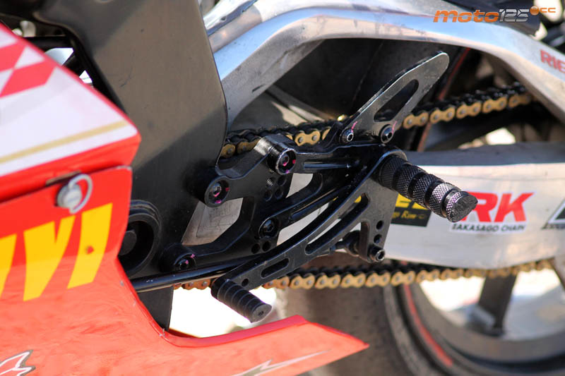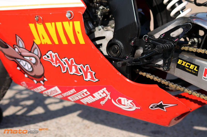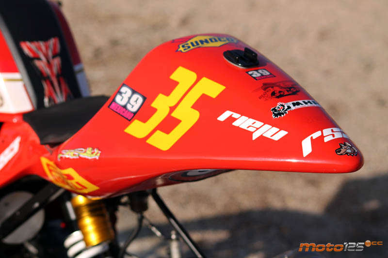 En lo que respecta al peso, los 138 kilos que pesa la moto de serie se han quedado en tan sólo 100 kilos: casi un 40% de adelgazamiento. En esa dieta se han cambiado las llantas por unas ultraligeras de 17 pulgadas (igual medida que la de serie), se ha prescindido de la cuna inferior del chasis (bajo el motor), semimanillares(de serie son de hierro macizo), nuevo carenado integral con colín y “ciego” por delante, eliminando todos los elementos legales que no se necesitan en carreras: intermitentes, faro, guardabarros trasero, piloto, pata de cabra…