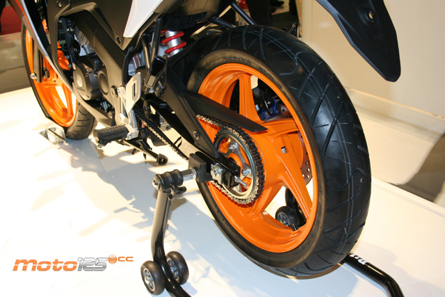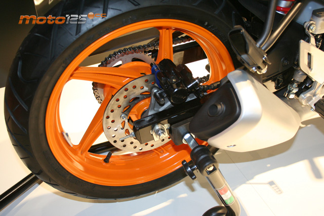 El peso total del conjunto es muy contenido, casi 137 kg, algo fundamental para obtener el máximo rendimiento de un motor de 125 cc. Ese peso se reparte casi por igual en sus dos ejes: un 49% delante y 51% detrás. Con el aumento de tamaño, también se aumenta la sección de los neumáticos: delante se pasa de 80 a los 100 mm, mientras que, detrás, se gana un 30%, con un perfil ligeramente más bajo. Se mantienen, eso sí, los mismos discos de la versión precedente: 276 mm delante y 220 detrás.