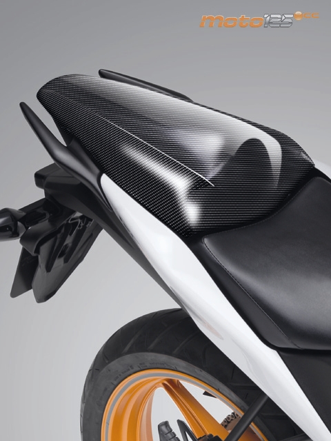 Salvando las distancias (casi la décima parte de la cilindrada), la nueva CBR 125R tiene un aire a la VFR 1200F. Fíjate, por ejemplo, en su faro de una sola óptica con los “rabillos” laterales superiores, la forma del tubo de escape con una moldura protectora que lo hace parecer más grande, o el colín posterior con esas características asideras apuntando hacia atrás. Como la anterior, la CBR se sigue fabricando en la filial de Tailandia, como también el propulsor: un 4T refrigerado por agua con cambio de seis velocidades, que le basta con dos válvulas en la culata para rendir casi 13 CV, alimentándose del sistema de inyección de Honda PGM-FI, con un cuerpo de acelerador de 30 mm de diámetro.