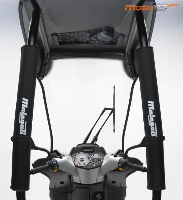 El accesorio cuesta 690 € sin montaje (se fija retirando el parabrisas original y anclándolo al escudo delantero y a la base del portabultos) e incluye un práctico limpiaparabrisas y una red elástica en el techo para llevar cosas a mano. Para una mayor protección se puede complementar con una manta para cubrir las piernas, y aún queda sitio detrás de la estructura del tejado para un baúl.