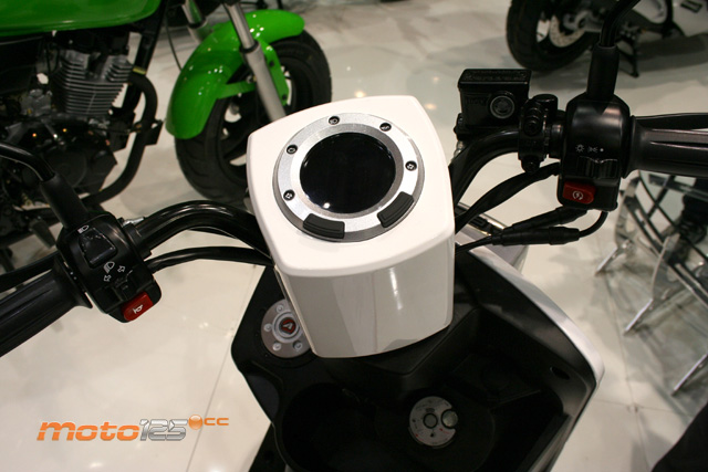 Detrás de su escudo frontal con faro rectangular, encontramos una guantera abierta con toma de corriente para cargar el móvil, cerradura multifunción con obturador magnético para protegerla y, a la izquierda, el tapón de gasolina para hacer los repostajes sin bajarse del asiento. Por supuesto, y como buen ciudadano que pretende ser, dispone de un suelo plano de amplia superficie, y bajo su asiento de superficie completamente horizontal, habrá capacidad de carga sobrada (no se especifican los cascos y tipos que contendrá). El manillar es de tubo desnudo con una caracasa cúbica en su centro que incluye un tablero de instrumentos circular y muy original también, con velocímetro en grandes dígitos, cuentakilómetros total y parcial y en su perímetro niveles gráficos de combustible y carga de la batería (por fin alguien se preocupa de informar de su estado para que no nos pille por sorpresa su defunción). El pasajero dispondrá de amplio espacio para sentarse, una asidera central en la parte posterior y estriberas plegables.