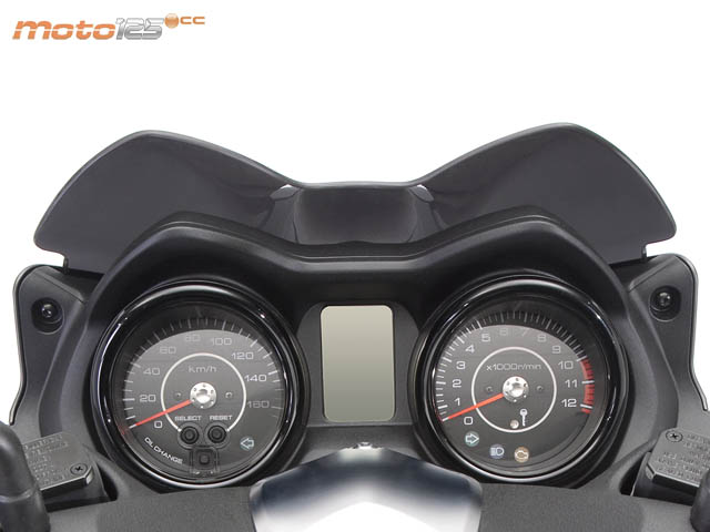 El completo cuadro de instrumentos con velocímetro, cuentavueltas y pantalla digital muestra ahora un cerco en sus relojes de color negro brillante. | Desaparece en este X-Max Sport el parabrisas delantero y, en su lugar, encontramos un deflector negro de baja altura. |