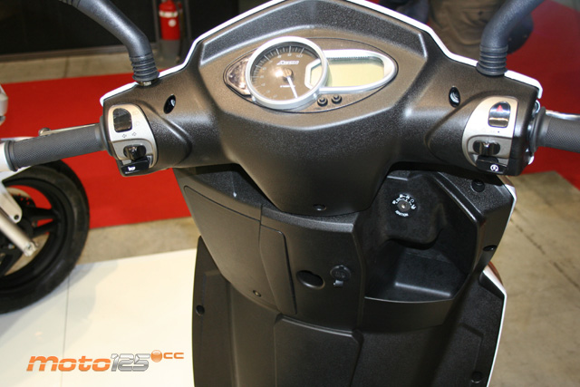 No dispone de ningún parabrisas en el manillar y se comparten muchos elementos con el GT Elite: la doble óptica (doble a su vez) que también empleará el Quadro 3D, el mismo tablero de instrumentos que combina un reloj analógico (cuentavueltas) con la pantalla digital, el grupo óptico posterior por matriz de diodos LEDs (tanto para el piloto como para los intermitentes) y el motor refrigerado por agua que roza el límite de potencia permitido para la cilindrada de la convalidación. |