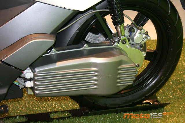 Una idea similar la habíamos visto el año pasado con otro prototipo híbrido de Malaguti, que este año no se ha presentado. El motor de 35 cc se encuentra por el lado derecho de la rueda trasera, el motor eléctrico en la parte delantera del basculante con transmisión a la rueda trasera por cadena y, superpuesto a la tapa izquierda que cubre la transmisión, el controlador eléctrico para disipar mejor el calor que se genera.