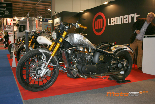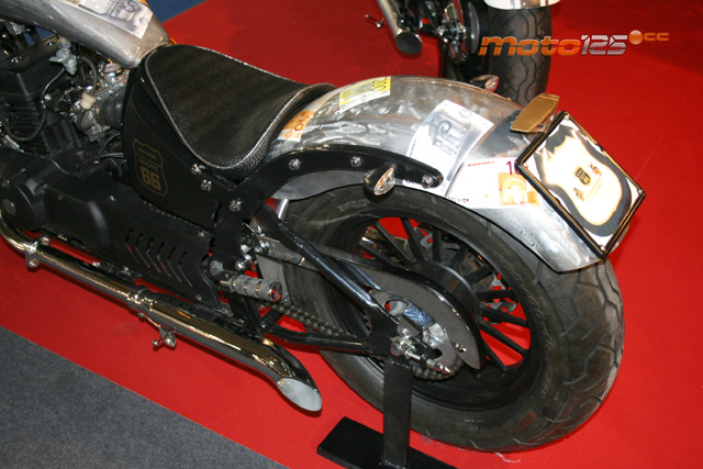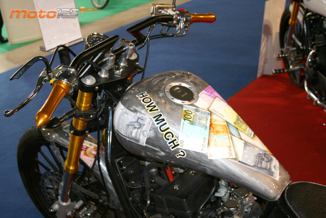 En Milán repitió presencia la marca de Mataró, con un stand bien ubicado en el pabellón dedicado a los modelos custom. Allí pudimos ver la gama actual de Spyder II, Daytona y Bobber –esta última con tren posterior rígido y completamente homologable- con motores bicilíndricos en línea refrigerados por agua y en las cilindradas de 125 y 350 cc. La auténtica novedad era una versión especial sobre la Daytona 125 creada en colaboración con el importador italiano Historic Route 66 y denominada How Much (cuánto). Para esta ocasión, se ha pulido el depósito de combustible, así como los guardabarros delantero y trasero, decorándose todos ellos con los diferentes billetes de euro (desde el de 5 hasta el de 500 €). Además, contaba con otras customizaciones: empuñaduras anodinadas en color cobre a juego con las botellas de la horquilla invertida, manillar en zig-zag y escapes independientes con salida biselada.