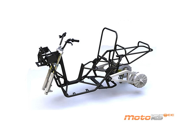 El “esqueleto” del Moose está muy bien dotado, sobre todo para poder transportar cargas de hasta 100 kg sobre su plataforma posterior, con un sistema de suspensión trasera independiente. El puesto de mando es muy similar al del Adiva de dos ruedas, variando solo el tablero de instrumentos, que ahora es más recogido y completamente digital. La toma de corriente se encuentra entre los dos faros delantero, y el conjunto de baterías se ubica bajo el asiento del conductor.