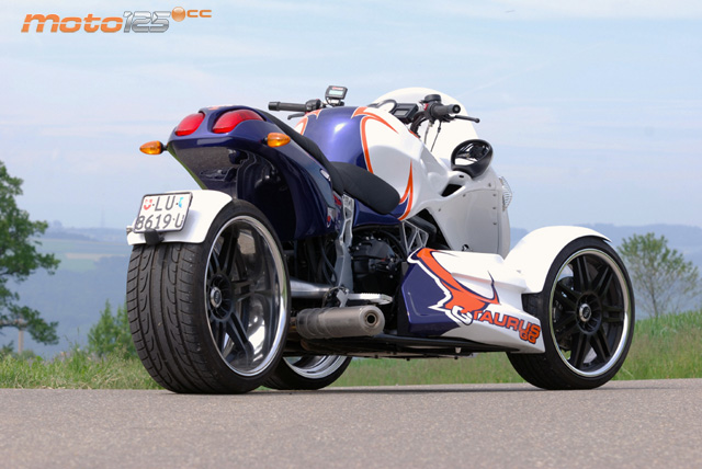 La de tres ruedas, el GG Taurus es un concepto muy similar al Spyder de Can-Am (también conducible con el carnet de coche), pero a lo bestia. Emplea como propulsor el tetracilíndrico de la BMW K1300 retocado en sus talleres para ofrecer una potencia de 175 CV a 9.250 rpm, que transmite el movimiento a la rueda posterior a través de un cardan. La caja de cambios es de seis velocidades con marcha atrás y, como el Spyder, no inclina aunque disponga de manillar. De ahí que utiliza unas ruedas de perfil rectangular (tipo coche) en lugar de redondeado. Los amantes del vértigo están de enhorabuena porque declara una velocidad máxima de 220 km/h (el Spyder no supera los 160 km/h).![]() |