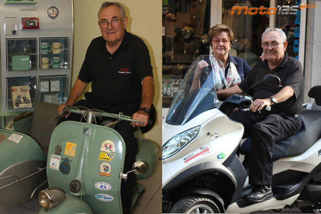 Lluis Casademont sobre dos generaciones Piaggio de tres ruedas que marcaron historia: una Vespa 125 con sidecar del año 1948 y, con la misma cilindrada, un Piaggio MP3 Hybrid actual. A su lado, junto al MP3, su mujer Adelina, también protagonista durante todos estos 50 años. | Este es el equipo que te atenderá en las amplias instalaciones que cuenta Motos Casademont en carrer Figuerola 49, en pleno centro de Girona. |