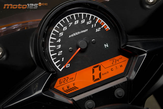 La información y aspecto del cuadro de instrumentos también ha ido a mejor. Como buena deportiva que se precia de ello, domina el reloj cuentavueltas con una zona roja muy arriba. En la pantalla digital hay todavía más con niveles gráficos de combustible y temperatura. | En el frontal se descubren influencias de los estilos de las Honda de gran cilindrada (caso de la VFR1200F), como es la óptica monofaro con los “rabillos” superiores hacia arriba, que incluyen sendas bombillas de posición. La óptica principal incluye bombilla halógena. |