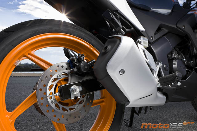 Estaba claro que la prioridad número 1 de los diseñadores de Honda era hacer crecer el tamaño de la nueva CBR. Aunque se sigue manteniendo la configuración doble viga en acero del bastidor, lo cierto es que todo es nuevo y con más longitud, más anchura y más altura que su predecesora. Todo resulta más acorde para las tallas altas del público europeo. Pero no te pienses que sobre la CBR125R vas a tener que llegar al suelo de puntillas en los semáforos, porque, aunque ha crecido la altura del asiento, esos 793 mm no resultan tan exagerados. Además, el hecho de compartir el mismo vestido del modelo de 250 cc –también fabricado en Tailandia- le da ese aspecto y tacto de moto grande, en el que también ponen su grano de arena unos neumáticos que mantienen el diámetro de 17 pulgadas, pero con una sección mayor.