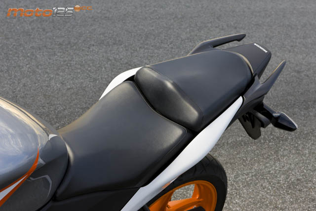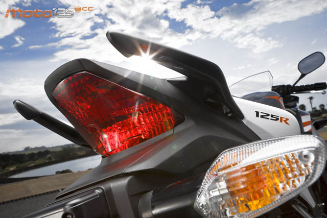 Sin duda con el aumento de tamaño, la nueva CBR “viste” mucho y puedes dar el pego de que montas en una moto de mayor cilindrada. Sin duda, es una buena terapia para quitarse los complejos. Como ya te hemos comentado, el hecho de compartir elementos de la carrocería con la “dos y medio” ayuda a esa confusión, y hay que ser muy observador para descubrir la cilindrada en unos discretos logos a ambos lados del asiento del pasajero. Pero es que, además, estéticamente, la nueva CBR125R tiene un aire a la VFR1200F. Obviamente, la pequeña –en cilindrada- CBR no llega a las megadimensiones de la Roadsport, pero sí que nos recuerda a ella en las formas estrechas de la parte posterior, el escape corto y voluminoso (aunque en realidad se trata de una moldura que lo abulta más) y ese característico faro de una sola óptica con los rabillos laterales superiores.