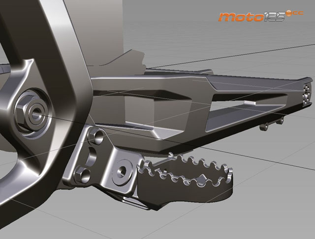 Detalle de la disposición lateral del amortiguador trasero de la JT de trial. | Las estriberas de la JT de trial y su colocación en el chasis. |