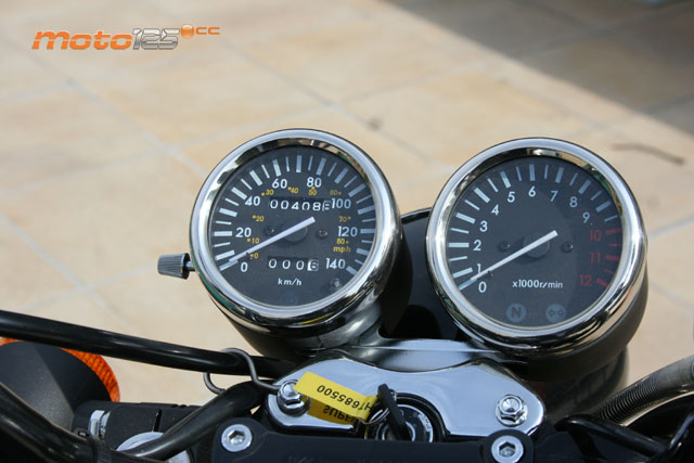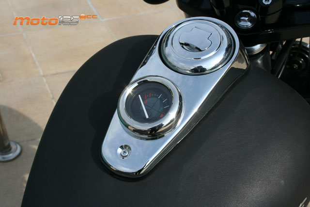 La información situada por delante del manillar se complementa con esta esfera que muestra el nivel de combustible y que se sitúa por encima del depósito y debajo de la boca de llenado. | El asiento tiene formas de silla de montar y está hecho de una pieza con el cojín del pasajero. La matrícula se sitúa por encima del piloto y el escape se bifurca bajo el motor con doble salida superpuesta (también acabado en negro). |