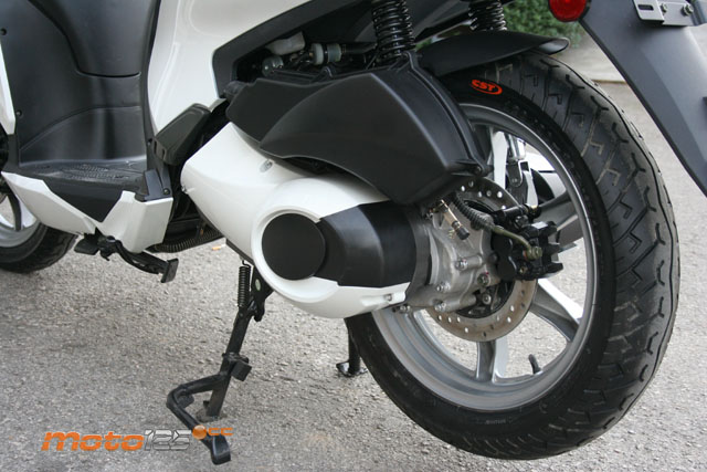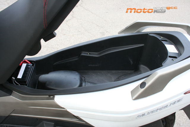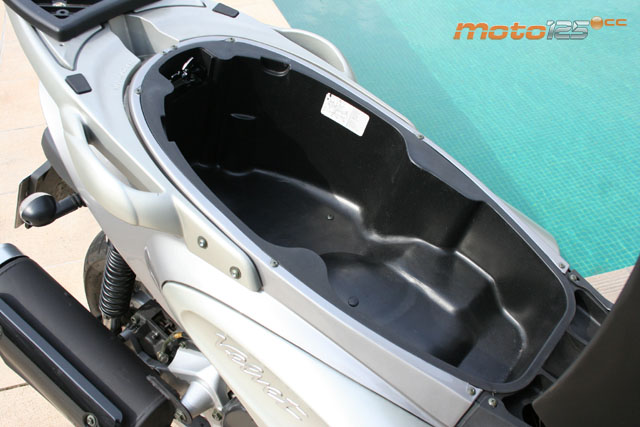 El asiento se abre desde la cerradura de contacto y deja a la vista un hueco talla XXL en el que se da cabida a un integral e, incluso, a algunos modelos de cascos abiertos delante de este. | Tren delantero excepcional para un scooter de bajo precio: rueda de 13 pulgadas con freno de disco de 240 mm. Detrás, la rueda es de 12 pulgadas y, a pesar de emplear un motor de aire, se recurre a otro freno de disco. |