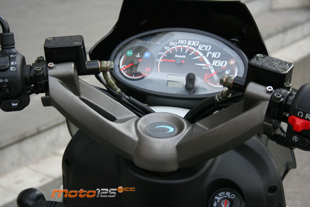 Tanto el motor como el escape están recubiertos por sendas molduras que se continúan en los laterales de la carrocería y que le da forma de boomerang. La mecánica está refrigerada por agua y cuenta con freno trasero de disco. | Marcando estilo en el puesto de conducción: el manillar es de fundición y sitúa delante de él un tablero de instrumentos muy completo y con un diseño que no desentona en la originalidad del conjunto. |