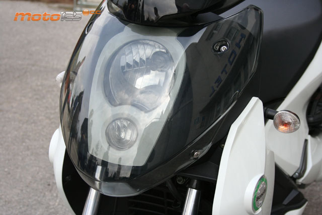 Doble óptica superpuesta de diferentes tipos detrás de un cristal que cubre todo el escudo. La superior y más grande es convencional, mientras que la de abajo es polielipsoidal. Ambas cuentan con bombillas halógenas. | Será un rueda alta futurístico, pero cumple con los cánones tradicionales: suelo plano para apoyar los pies, estriberas plegables para el pasajero, caballete lateral y guantera tras el escudo. |