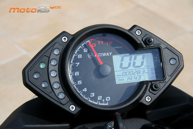 El tablero es muy completo en información, combinando una gran esfera analógica de cuentavueltas (fíjate a qué régimen empieza la zona roja), con una pantalla digital (con hora y nivel gráfico de gasolina) y hasta nueve testigos. | Lujo para una naked deportivo-turística “low cost”: amortiguadores oleoneumáticos con regulación de precarga de muelle y neumáticos ¡radiales!. Fíjate en el detalle de las asas laterales con ganchitos para sujetar los pulpos. |
