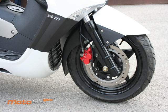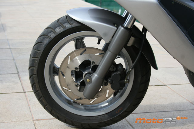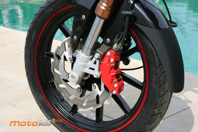 Ni siquiera el tablero es el mismo, aunque la información que reúne es muy similar, reduciéndose el tamaño del cuentavueltas y aumentando el de la pantalla. Se añade una llave de contacto con obturador, como en los scooters. | Soberbio tren delantero. A la horquilla invertida se le suman unas llantas de 10 palos, con neumático de perfil más plano y más ancho, freno de disco lobulado y una pinza de freno en color rojo muy sobredimensionada. |