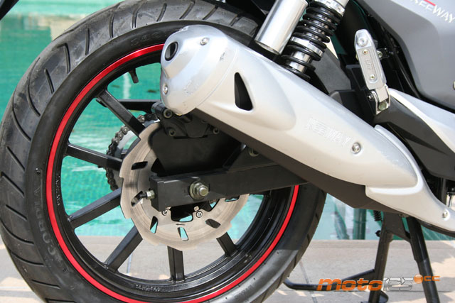 Detrás también se luce con amortiguadores oleoneumáticos de doble paso de muelle, un escape de formas muy agresivas, freno de disco lobulado, neumático ancho y llanta con el cerco en rojo metalizado. | El motor es, junto con el bastidor, de los pocos elementos que se comparte con la RKS. Para esta ocasión, las tapas de los cárteres están acabadas en color negro y tampoco cuentan con pedal de arranque. |