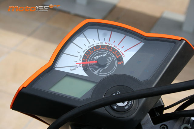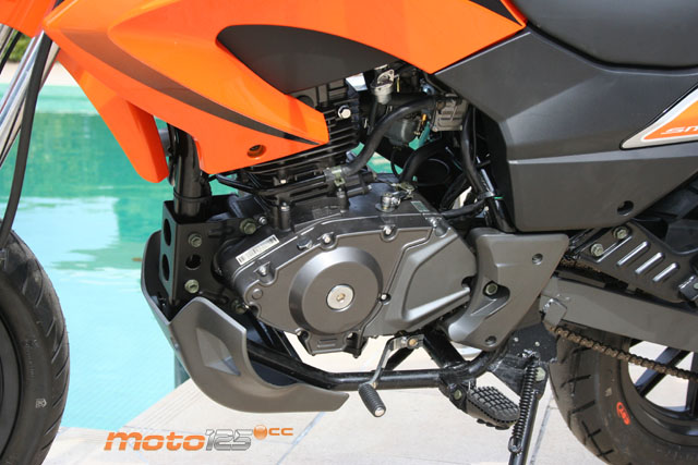 Seguro que nunca has visto un tablero con estas formas, un tanto desaprovechadas. A la derecha se sitúan los testigos luminosos y, a la izquierda, una pantalla digital con una curiosa forma de rombo. | El motor “compartío” con la RKS y RKV. La placa que lo protege es un tanto aparatosa. Fíjate en las estriberas: son de dentado, pero se han recubierto con una goma pensando en un uso urbano diario. |