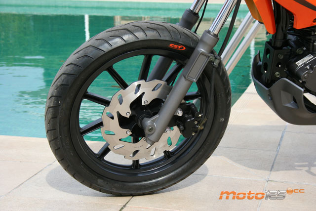 En ese uso funcional, la TX dispone de una parrilla portabultos detrás del asiento. Su aspecto es muy sólido y se prolonga lateralmente hacia delante formando unas asideras para el pasajero. | La rueda delantera va a la última con su respectivo freno de disco de perímetro lobulado y una horquilla de eje adelantado no invertida. En la versión SM, las llantas y los neumáticos coinciden con los de la RKV 125. |