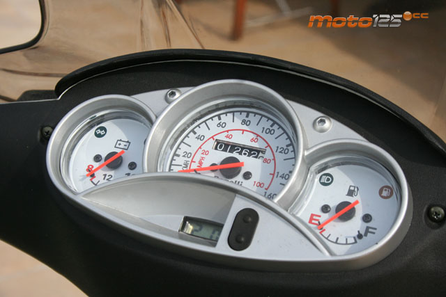 El motor es el nuevo de aire forzado que mejora en potencia y suavidad. Cambia también su aspecto exterior, agradeciéndose el uso de un pedal de arranque para su puesta en marcha cuando falle la batería. | En el tablero descubrimos en la esfera de la izquierda un voltímetro que indica la carga de la batería: una información poco habitual en un scooter. Todo está muy bien dispuesto facilitando la lectura. |