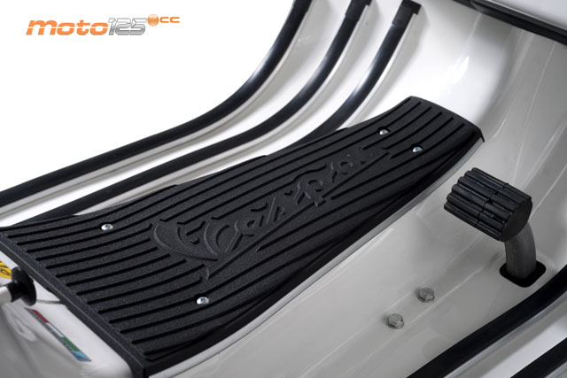 Después de una ausencia de casi cuatro años, la PX vuelve con mínimos cambios externos. Uno de ellos es la alfombrilla sobre el travesaño central que incluye ahora el logotipo clásico de Vespa. | Otra de las modificaciones cosméticas incluidas en la PX 125 ’11 es el nuevo asiento. Las duras aristas laterales en la zona del conductor han sido redondeadas para suavizarlas y, a la vez, permitir llegar con más facilidad al suelo. |