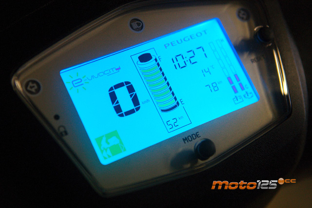 El cuadro de instrumentos ofrece mucha información y en color, aunque a luz de día apenas se notan las diferentes tonalidades. Además de la velocidad, aparece en el centro una especie de pila segmentada que informa del nivel de carga disponible, con una estimación en la parte inferior de la autonomía restante. Justo a la derecha, el reloj horario y, debajo de él, la temperatura ambiente (parpadea a la izquierda un icono que avisa del riesgo de helada), otro icono que avisa de que hay que visitar el taller por alguna anomalía, y el cuentakilómetros, que conmuta entre total y parcial. Y a la derecha del todo, dos niveles gráficos verticales para la temperatura de las baterías y la del motor; no hace falta estar pendiente de ellos, porque, en caso de que se supere un umbral, se desconectará todo evitando posibles “catástrofes”. Durante nuestra toma de contacto, no superamos los dos ladrillitos en ambos niveles de temperatura.