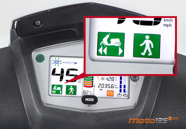 El botón Mode del cuadro de instrumentos ofrece diferentes modos de funcionamiento. Por defecto, nada más mantenerlo pulsado un par de segundos después de dar el contacto, aparece un icono con dos triangulitos apuntando a la izquierda. Ese es el modo normal de funcionamiento, que proporciona unas más que correctas aceleraciones gracias a los 14 Nm de par que entrega el motor eléctrico (comparables con las salidas de la versión térmica de 125 cc) y una velocidad máxima de 45 km/h. Con toques sueltos del botón Mode podemos conmutar a otro con un solo triángulo apuntando también a la izquierda, que es el de conducción económica, con una velocidad máxima de 25 km/h comparable a la de las bicicletas eléctricas de pedalada asistida. Y quedan otros dos modos: uno con un solo triángulo apuntando a la derecha que te permite moverte marcha atrás lentamente (remando con los pies y a 2 km/h como máximo) para hacer maniobras con carga, y otro en el que se ilumina un icono de un peatón andando con el que se circula a unos 6 km/h (velocidad de paseo).