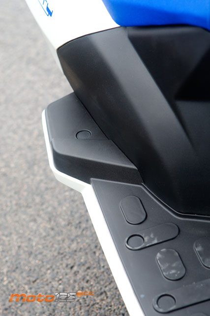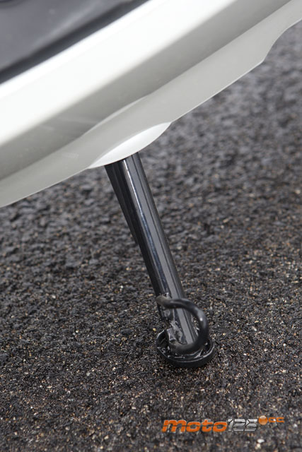 La pata de cabra (caballete lateral) desluce bastante las buenas virtudes del e-Vivacity, ya que se recoge sola y no cuenta con mecanismo de desconexión. En otras palabras, no te puedes fiar de ella porque el scooter acabará en el suelo. | El pasajero cuenta con unas zonas reservadas en las prolongaciones posteriores de la plataforma plana para apoyar los pies. No son estriberas desplegables, pero al menos sobresalen más de lo habitual. El asiento es algo corto para él. | La capacidad de carga es uno de los puntos fuertes del e-Vivacity. Se mantienen los 35 litros de capacidad repartidos en el hueco trasero y delantero. En este último, cabe un casco abierto o “Jet” (de ahí su denominación: Jet-In) |