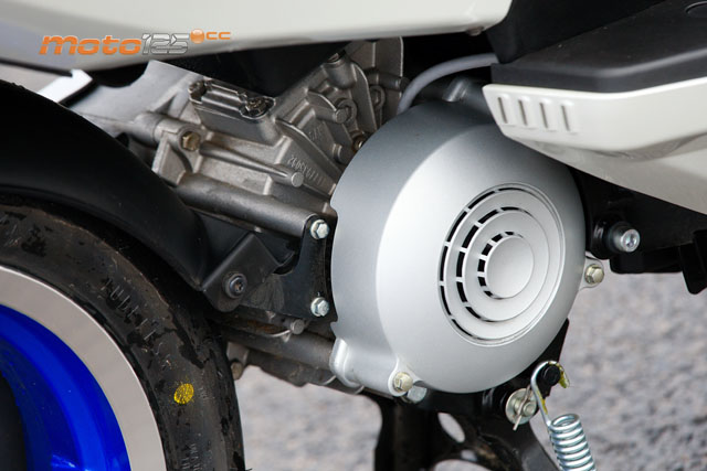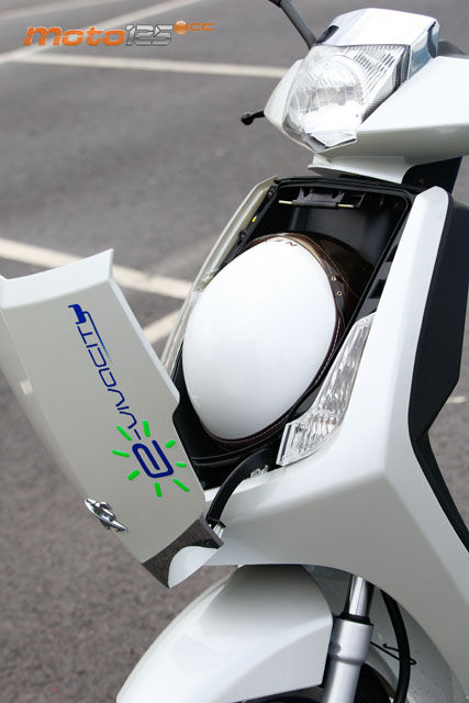 Bajo el asiento cabe un casco integral con holgura. Delante de él se ha habilitado un rinconcito donde se recogen los dos metros de cable para recargarlo a la red eléctrica y el conector de 12V para cargar el móvil. | El motor eléctrico ofrece 3 kW de potencia (poco más de 4 CV) y un par de ¡14 Nm! Se ha integrado en un cárter que bascula con la rueda posterior junto con la transmisión directa por correa (no hay variador ni embrague). | En la versión blanca-azul, las llantas van pintadas en azul eléctrico, con el cerco de la llanta pulido. Se luce más la rueda trasera, al no disponer de escape por este lado. Al freno de tambor trasero le falta potencia: mejor un disco. |