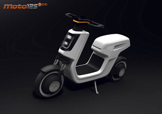 Quizá lo más destacable de este modelo sea su bajo peso conseguido gracias a unas dimensiones muy compactas y que, sin baterías, registra tan solo en la báscula 20 kilos. Para tan bajo peso, se conforma con un motor de 350 W (0,35 kW, o lo que es lo mismo, casi medio caballo de potencia) que le permite alcanzar una velocidad máxima de unos 50 km/h (suficientes para homologarlo como ciclomotor) con un autonomía de unos 60 km. No hay hueco para guardar el casco bajo el asiento sino que, levantándolo, se accede a la batería que es extraíble para permitir su recarga en un domicilio particular, la solución más práctica cuando todavía es pronto para hablar de postes de recarga o recurrir a tirar del enchufe de un garaje comunitario. Por cuestiones de precio (VW pretende no superar la barrera de los 1.000 dólares, unos 700 euros al cambio), las baterías son de NiMH algo anticuadas y pesadas si las comparamos con las de Litio, opción que se baraja si el mercado lo solicita.