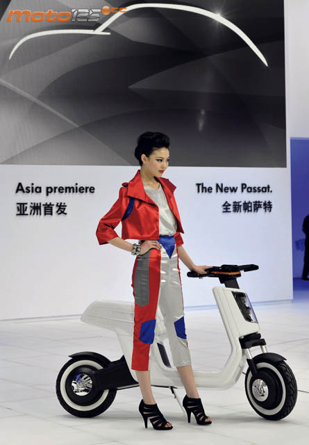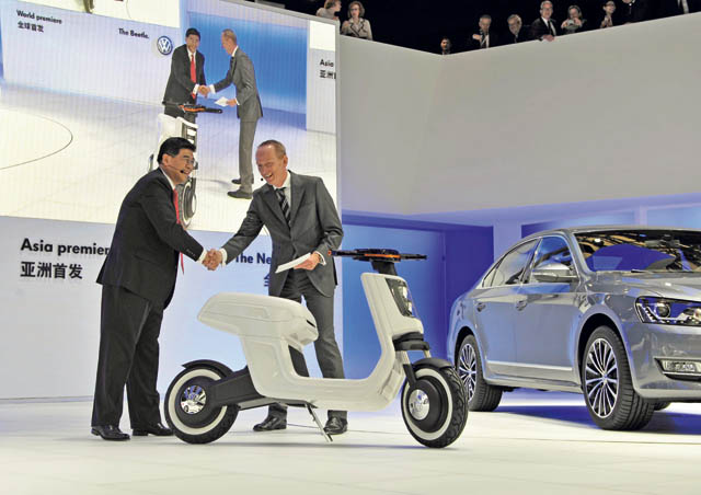 Weiming Soh, VicePresidente Ejecutivo de Ventas de Volkswagen en China apareció en el escenario de la presentación en Shanghai con el prototipo del e-Scooter. Fue la novedad junto con el nuevo Escarabajo y Passat. | La idea del renting no está mal. La alquilas y cuando está a punto de agotarse la batería te pasas por un punto de alquiler en la ciudad y la cambias por otra “con las pilas llenas” y sigues tu recorrido sin perder el tiempo. |