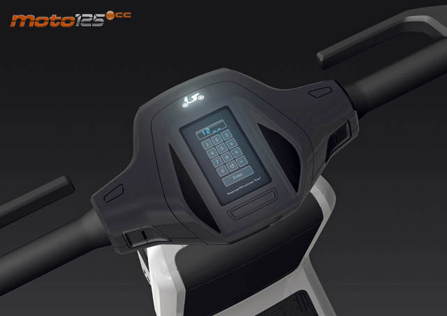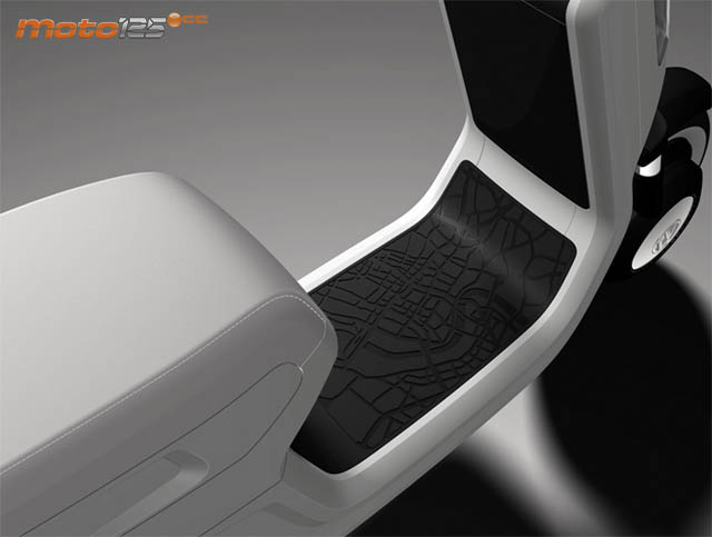 De momento el proto es muy de diseño y poco funcional. Fíjate en las manetas de freno al revés y los conmutadores. El tablero es una pantalla que adopta cualquier forma gráfica y táctil. En este caso está esperando el código de seguridad. | A pesar de que su parte ciclo pese tan solo 20 kilos, el diseño permite adoptar en el VW eScooter un suelo plano con alfombrilla de goma imitando el plano de una ciudad. El escudo no protege mucho. |