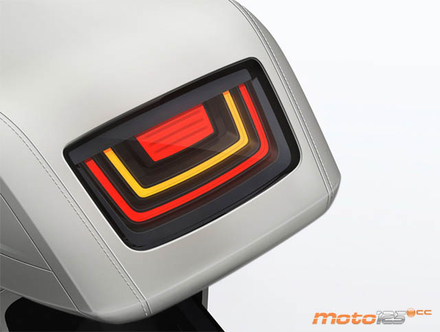 Diseño también en el piloto posterior con todo encendido. El centro corresponde a la luz de freno, la “U” amarilla son los intermitentes y parpadean por mitades laterales, y la roja exterior es la de posición. | Mucho tienen que cambiar el eScooter para que se pueda homologar. Vale por los intermitentes en los extremos del manillar pero los dos faros cuadrado de diodos LEDs en el escudo y la hilera naranja en el manillar… |