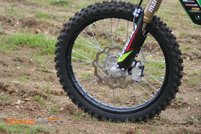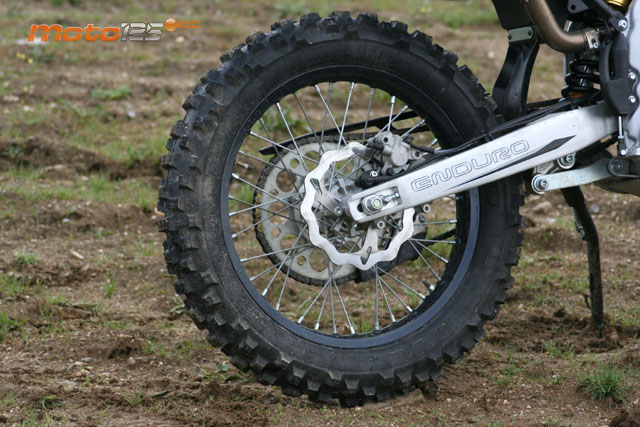 La rueda delantera aporta muchos cambios. Para empezar, está calzada con neumático Michelin Enduro Competition MS y el freno es ahora de 250 mm (también lobulado), con pinza de anclaje sencillo, pero flotante. | El motor Minarelli WR 125, refrigerado por agua con culata de 4 válvulas, estrena un pistón que aumenta la compresión. Además, recurre a un escape más “liberado” y un segundo semiradiador por este lado. |