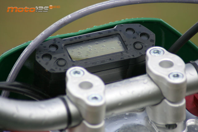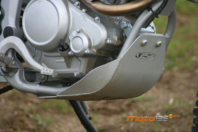 Tras el portafaros, un simple y sencillo tablero de instrumentos que sólo muestra la velocidad y los kilómetros recorridos, además de cuatro testigos luminosos. Se prescinde de la cerradura de contacto-bloqueo. | Un buen detalle que deberían incorporar incluso las enduro de serie para evitar disgustos: el protector de cárter. Dispone de prolongaciones laterales e, incluso, se ha personalizado con el logo de la marca troquelado. |