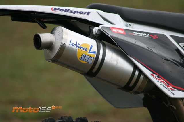 El basculante es de fundición de aluminio (como en la Pro) y cuenta con bieletas para el monoamortiguador (progresividad variable). El disco de freno trasero sube hasta los 220 mm manteniendo el perímetro lobulado. | Otra de las mejoras que afectan al rendimiento del motor vienen por la utilización de este terminal de escape firmado por LeoVince. Está fabricado en aluminio y prescinde del catalizador para no retener los gases. |