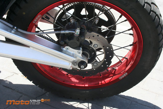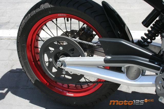 En el tren delantero, la horquilla invertida crece en recorrido hasta los 240 mm, en parte culpable de la exagerada altura del asiento (subsanable). El freno de disco es el mismo de la S: uno de 310 mm lobulado con pinza de anclaje radial. | La llanta posterior es de 16 pulgadas. Al fondo se puede ver la transmisión final por correa dentada (común con la S) y en primer plano el freno de disco trasero, también lobulado, con latiguillo metálico y diámetro de 220 mm. |