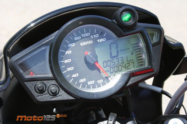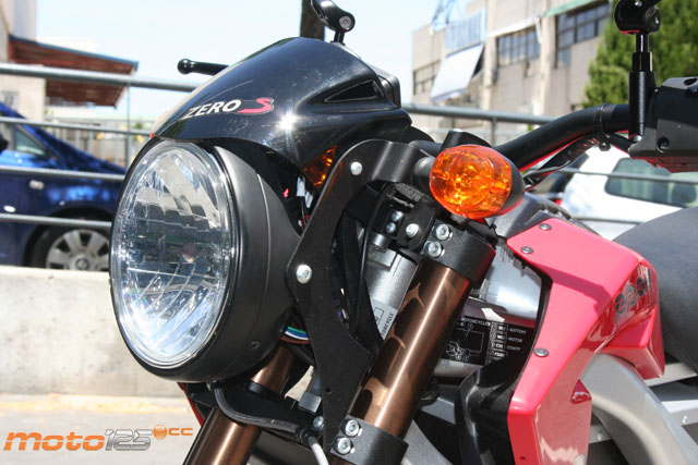 Aspecto sencillo y funcional. El gran faro redondo montado sobre las tijas de la horquilla invertida, dispone de un deflector en su parte posterior tras el que se esconde el completo tablero de instrumentos. | El tablero es como el de las motos de gasolina. No se muestra la información del cuentavueltas y por eso se repite la de velocidad en forma digital y analógica. A la derecha de la pantalla digital el nivel de batería. |