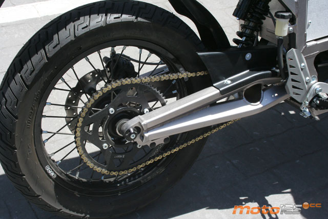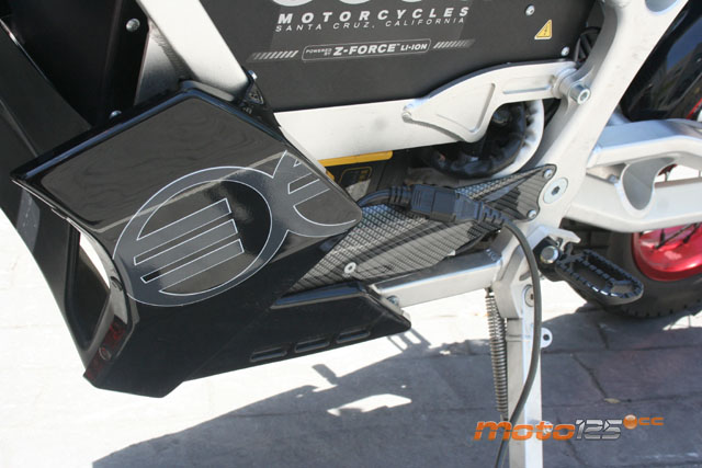 La transmisión a la rueda trasera se ha abaratado un poco al sustituir la correa dentada de los modelos conocidos por una cadena convencional. Eso sí, se sigue empleando el aluminio tanto para el basculante como para el bastidor. | El cargador integrado se ha ubicado delante de la doble cuna del chasis por delante del motor simulando un carenado inferior. La recarga completa se hace en un par de horas y se puede bajar a 1,2 horas con uno externo rápido. |