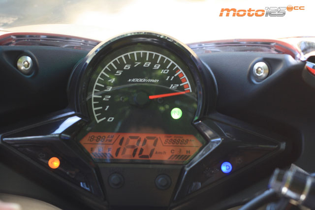 La CBR no se acompleja cuando la sacas de los semáforos y entras en vías de circunvalación o carretera abierta. Como seguro que te habrás fijado en el “ranking” de las 125 cc más rápidas que aparece en la columna gris de la derecha, la CBR está en los puestos de cabeza con unos más que dignos 122,5 km/h de velocidad máxima (unos optimistas 136 en su velocímetro digital), poquito menos de lo que registra una sofisticada Rieju RS3 de ¡15 CV! Está claro que Honda ha hecho un buen trabajo de aligeramiento en su CBR para compensar su inferior caballería (aunque sea a costa de perder algo de aplomo en carretera) y, al final, se consigue un resultado similar, con un precio inferior.