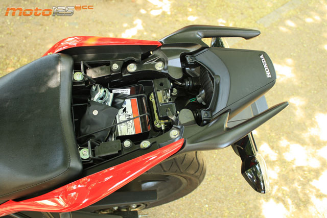La saga posterior es muy de la casa, aunque integrando el portamatrículas. Los laterales (con el 125R en pequeñito) siguen el estilo de la VFR 1200. Observa el bultito central delantero del asiento del pasajero imitando las formas de un colín. | El radiador se esconde en el paso de rueda delantero. No te creas que por estar tan oculto no trabaja bien: el flujo de aire penetra sin problemas y lo hace muy efectivo, cumpliendo a la perfección su cometido. | El monoamortiguador posterior es muy sencillo. Cuenta con hidráulico, pero carece de bieletas y de ajustes de precarga. Delante de él se encuentra el vaso de expansión del circuito de refrigeración. |