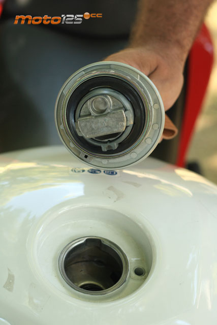 El tapón de gasolina dispone de cerradura, pero no nos ha gustado que le falte una bisagra. Se ha ganado en capacidad con respecto a la versión anterior (13 litros), aunque una varilla que hace de tope para la manguera obligará a repostar lentamente. | Las estriberas del conductor y pasajero están recubiertas de goma para minimizar las pocas vibraciones del motor. La pata de cabra cuenta con cortacorrientes que funciona cuando el cambio no está en punto muerto y la palanca de cambios esconde su reenvío. | El tren delantero sigue empleando una llanta de 17 pulgadas, ahora de nuevo diseño de cinco palos y con neumático de sección más ancha. La horquilla es algo justita para una 125 cc (31 mm de barras) y el disco de 276 mm va sobrado. |